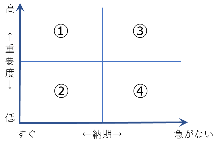 以下の図のように、「重要度と納期の4ブロック」を頭に置いてメモの最後に番号を付けます。打ち合わせの最後には、優先順位が正しいかどうか確認を忘れずに。