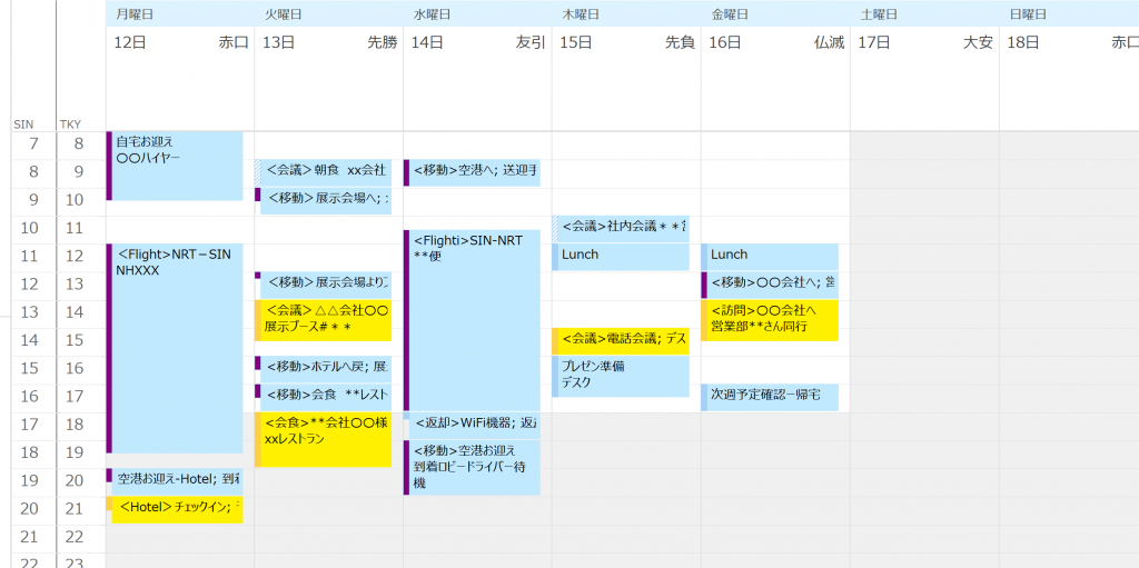 上記、「公開方法」の図でも示してある通り、クライアントに関するアポイントが確定した場合は黄色、社内に関する予定が確定した場合は緑となどと分類を使って色付けしています。