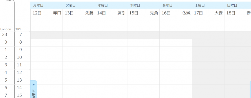 Outlookではカレンダーの時間帯を3つまで表示することが可能です。下の画像のように、日本時間の横に先方の時間帯を表示させるといちいち時差を考えなくていいのでとっても楽です。