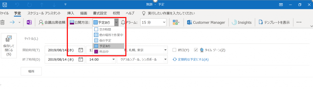 - 会議、クライアント訪問、書類整理の時間など何かしている時は「予定あり」を選択