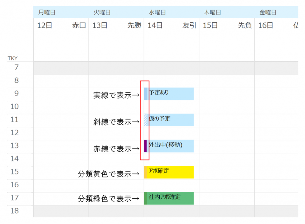 上記のように選択しておくと、そのスケジュールの左端が斜線や実線などで表示され、上司が一目で「あ、この時間は外にいるんだな」などと視覚的に判断できます。(下図参照)