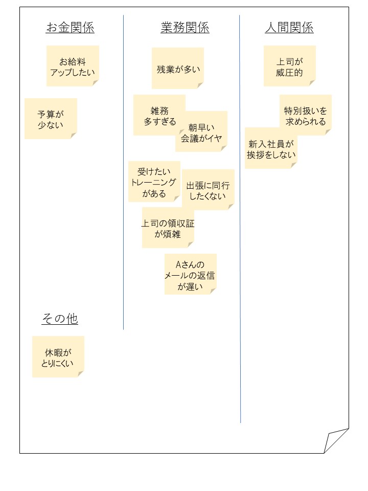 この段階で、各カテゴリーの中で付箋が一番多いものにフォーカスします。私は図の通り「業務関係」のモヤモヤが一番多かったので、ここを掘り下げてみました。