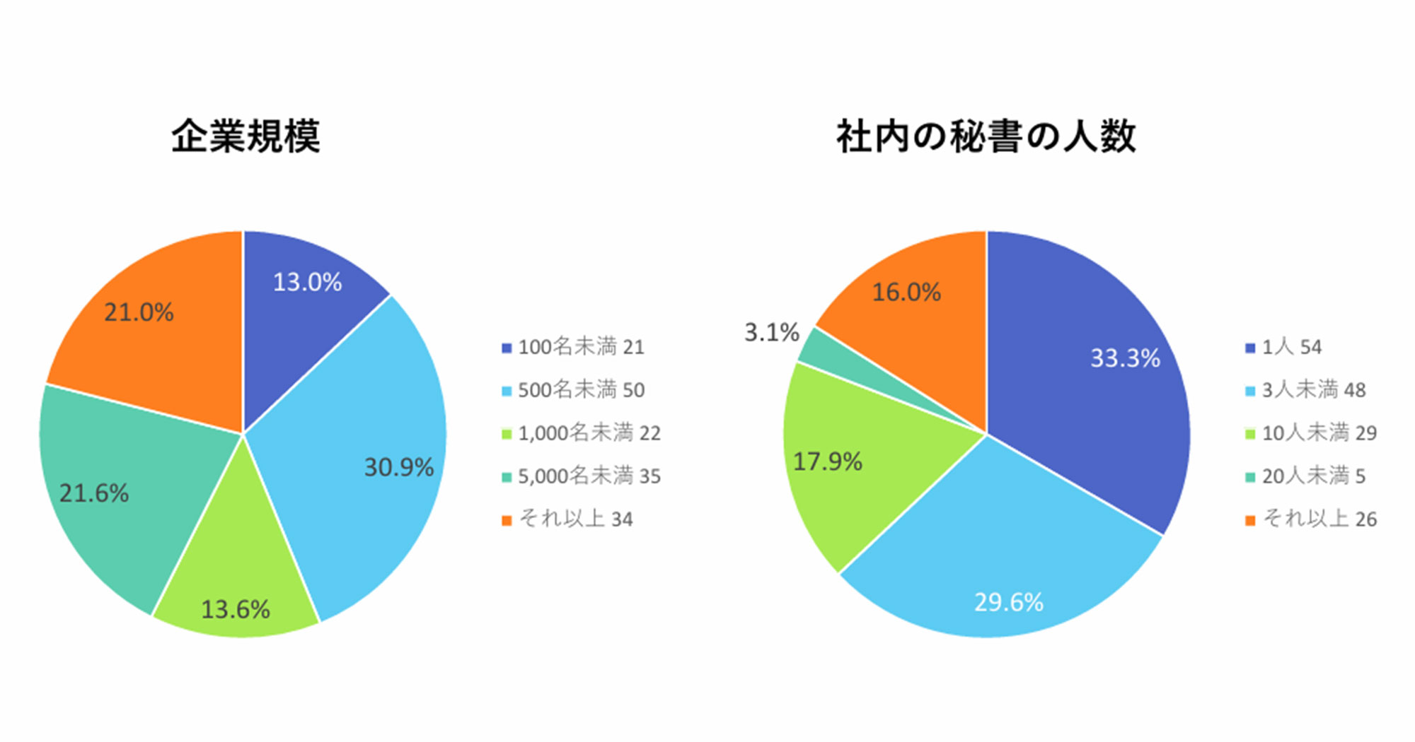 次にご紹介するのは、秘書の皆さんがどんな規模の企業で働いているか、そして社内に何人の秘書がいるのかという項目です。