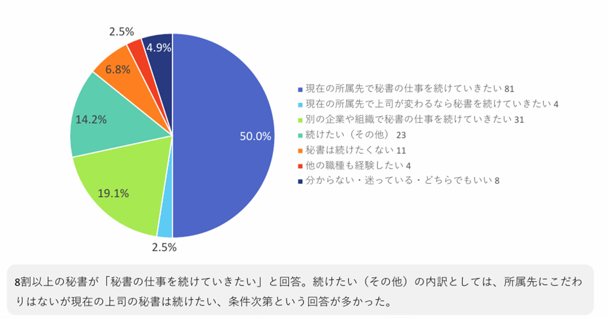 アンケートでは「秘書の仕事を今後も続けたいですか?」という問いに対し、8割以上の方が「続けたい」と回答していました。