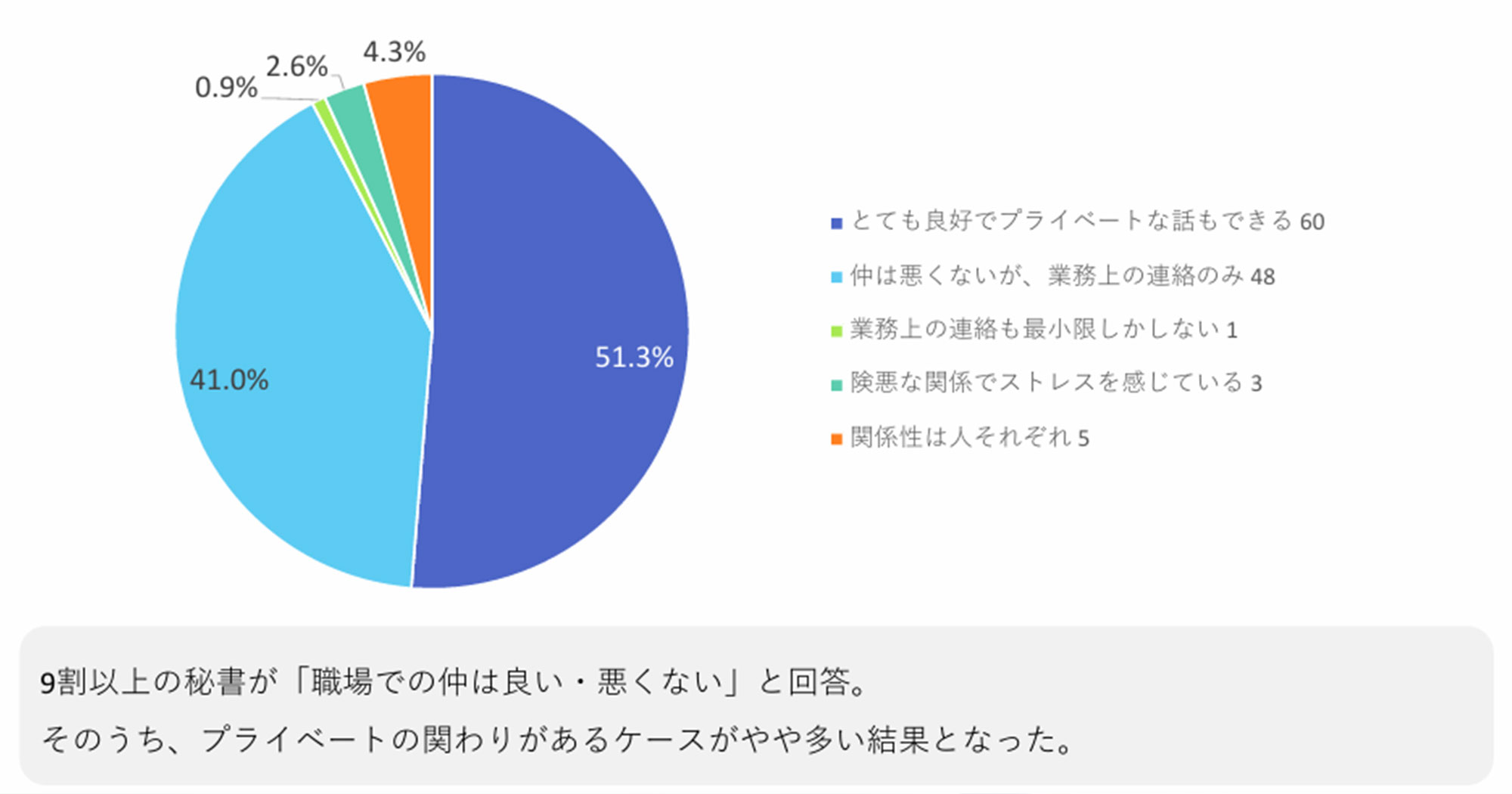 「業務連絡のみ」という方もいますが、9割以上が「仲は悪くない」と感じている結果でした。