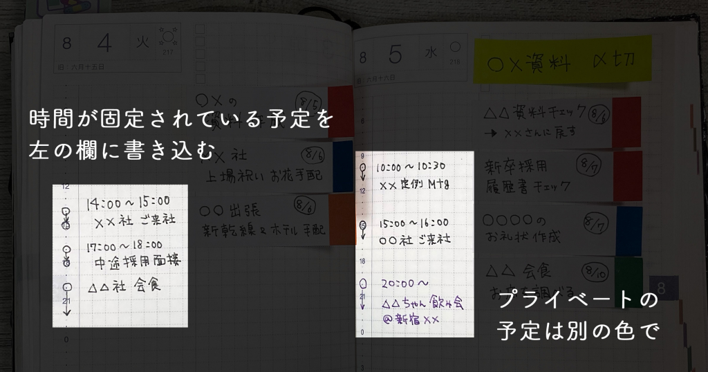左には、お客様のご来社予定や社内打ち合わせなど、時間を動かすことのできないスケジュールを書きます。