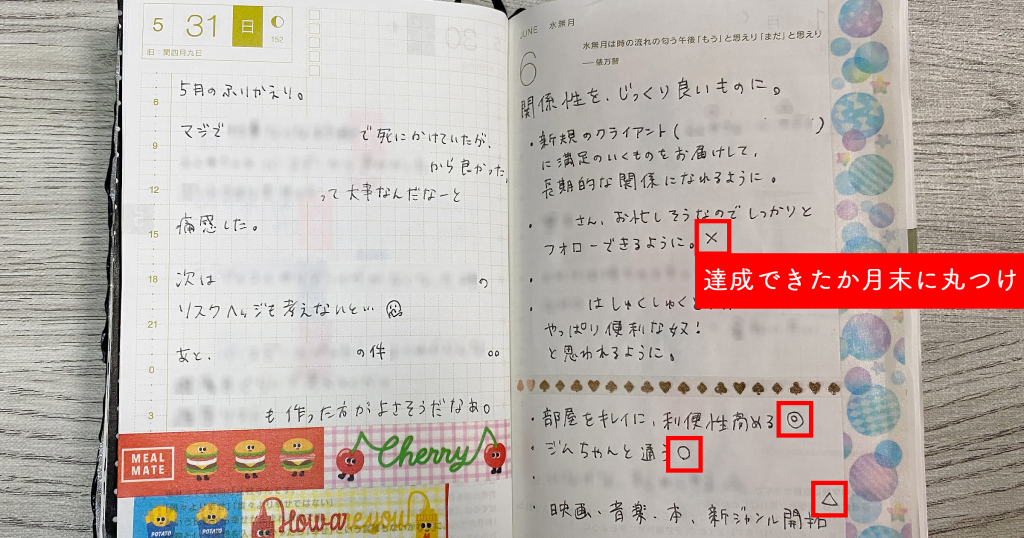 他にも、「あの本を読む」「ジムに○回行く」などプライベートな目標も書いたりしてます。