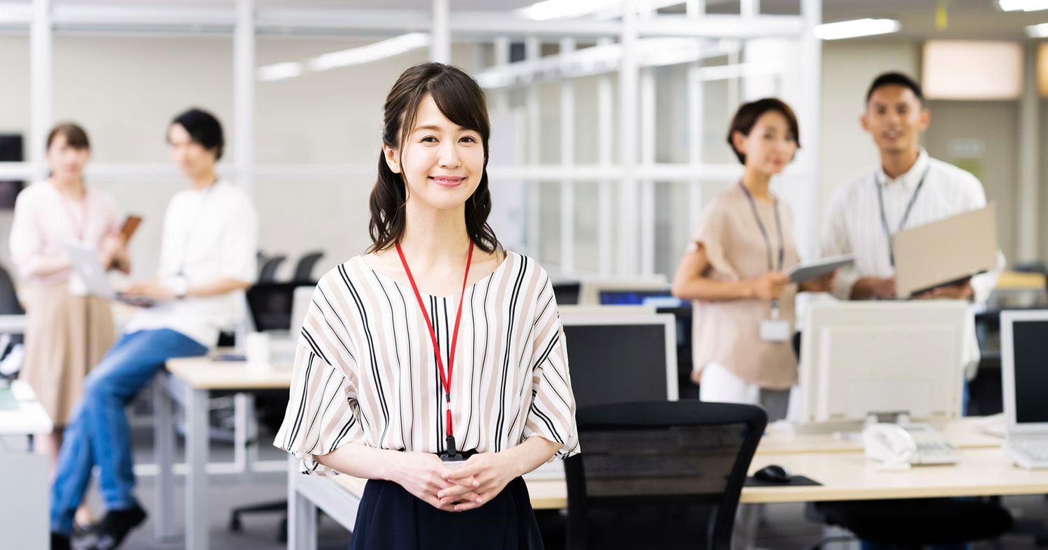 きれいな色も適度に揃い、スカート丈も短すぎず、シンプルにまとめた顔まわりは、お茶出しや書類整理などでも邪魔になりません。