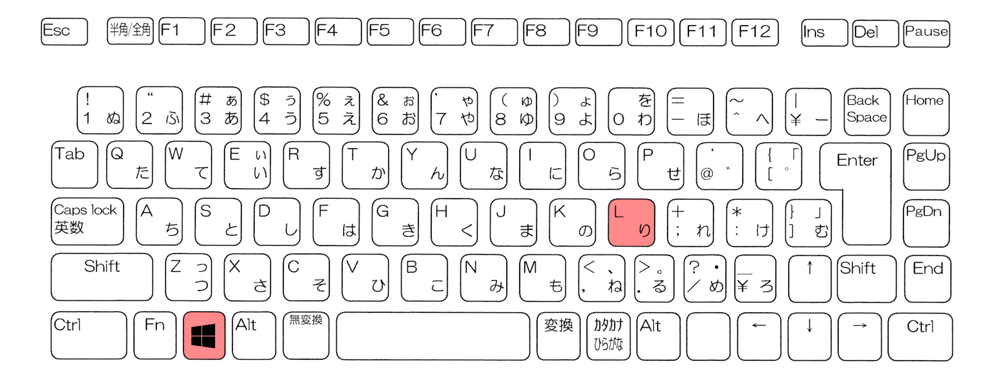 「Windows」キー(Windowsのロゴマーク)を押しながら「L」キー(Lockの頭文字と覚えましょう!)を押すことで、パソコンに一瞬でロックをかけることができます。