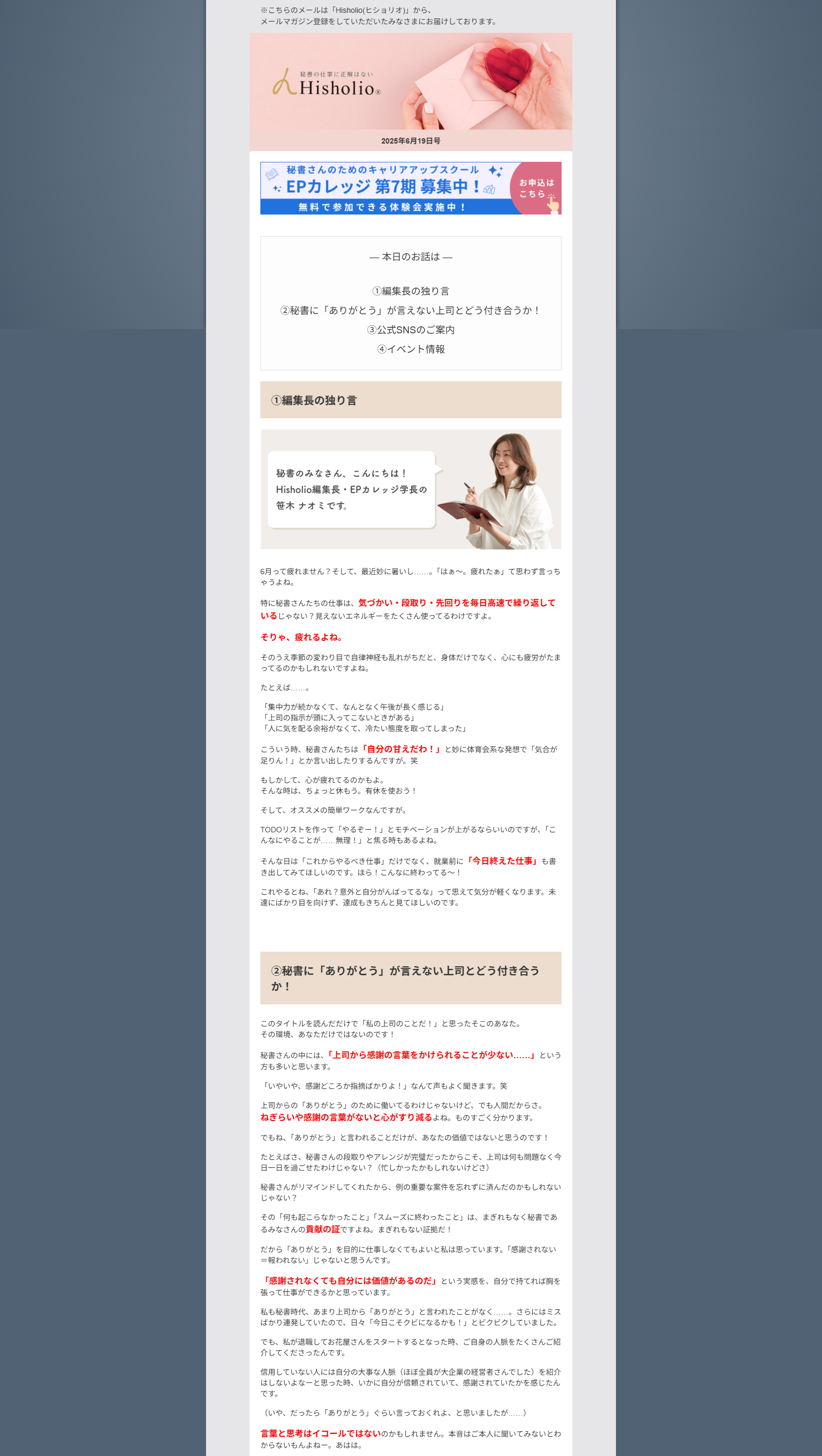 Hisholio編集長の笹木ナオミより、週に一度秘書メルマガをお届けします。